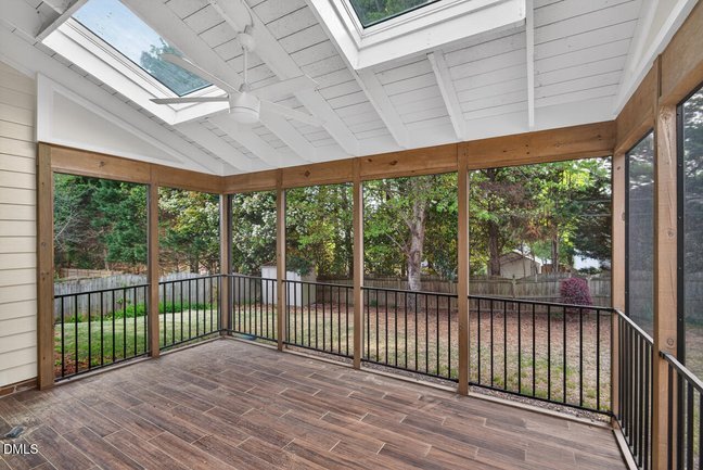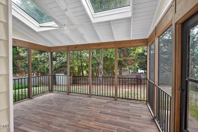 Charming home that truly lives like a ranch with the added bonus of a private upstairs bedroom--perfect for guests, a home office, or flex space! Step inside to a bright, open floor plan featuring tall living room ceilings, abundant natural light, and beautiful wood floors throughout the majority of the home. The spacious living room centers around a cozy fireplace and flows seamlessly into the dining area and kitchen, creating an ideal layout for both everyday living and entertaining. The kitchen offers granite countertops, ample cabinet space, and a sunny breakfast nook overlooking the backyard. The main-level primary suite is a true retreat, featuring a 2024-updated shower, soaking tub, and generously sized walk in closet. Additional main-floor bedrooms provide easy, one-level living--reinforcing the home's ranch-style functionality. Upstairs, a versatile additional bedroom with private en suite offers privacy and flexibility! Enjoy year-round relaxation in the screened porch with skylights, bringing in natural light and peaceful outdoor views. Outside, the fenced backyard with a storage shed provides space for pets, gardening, or play. The 2-car garage with built-in storage shelves adds convenience and organization.