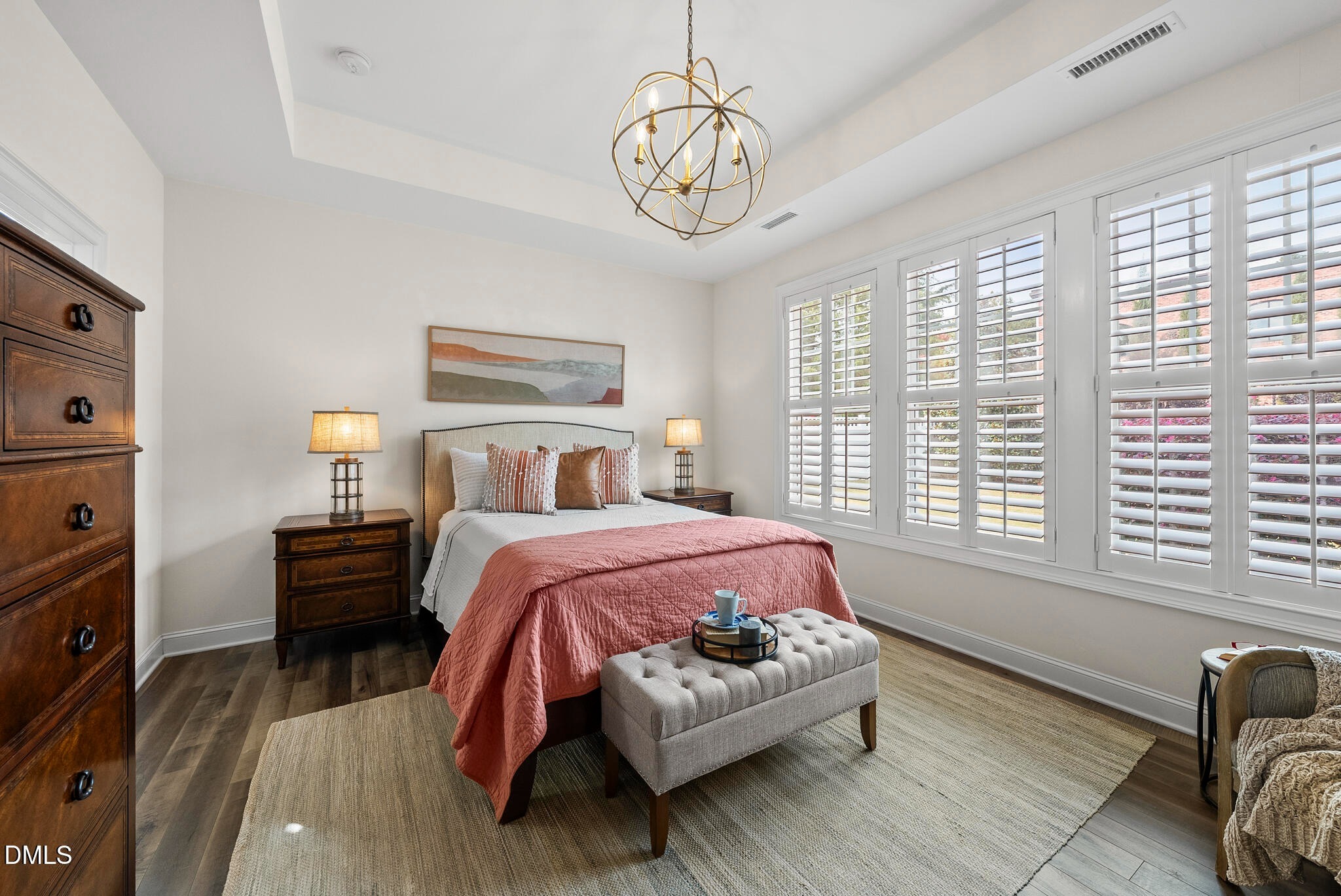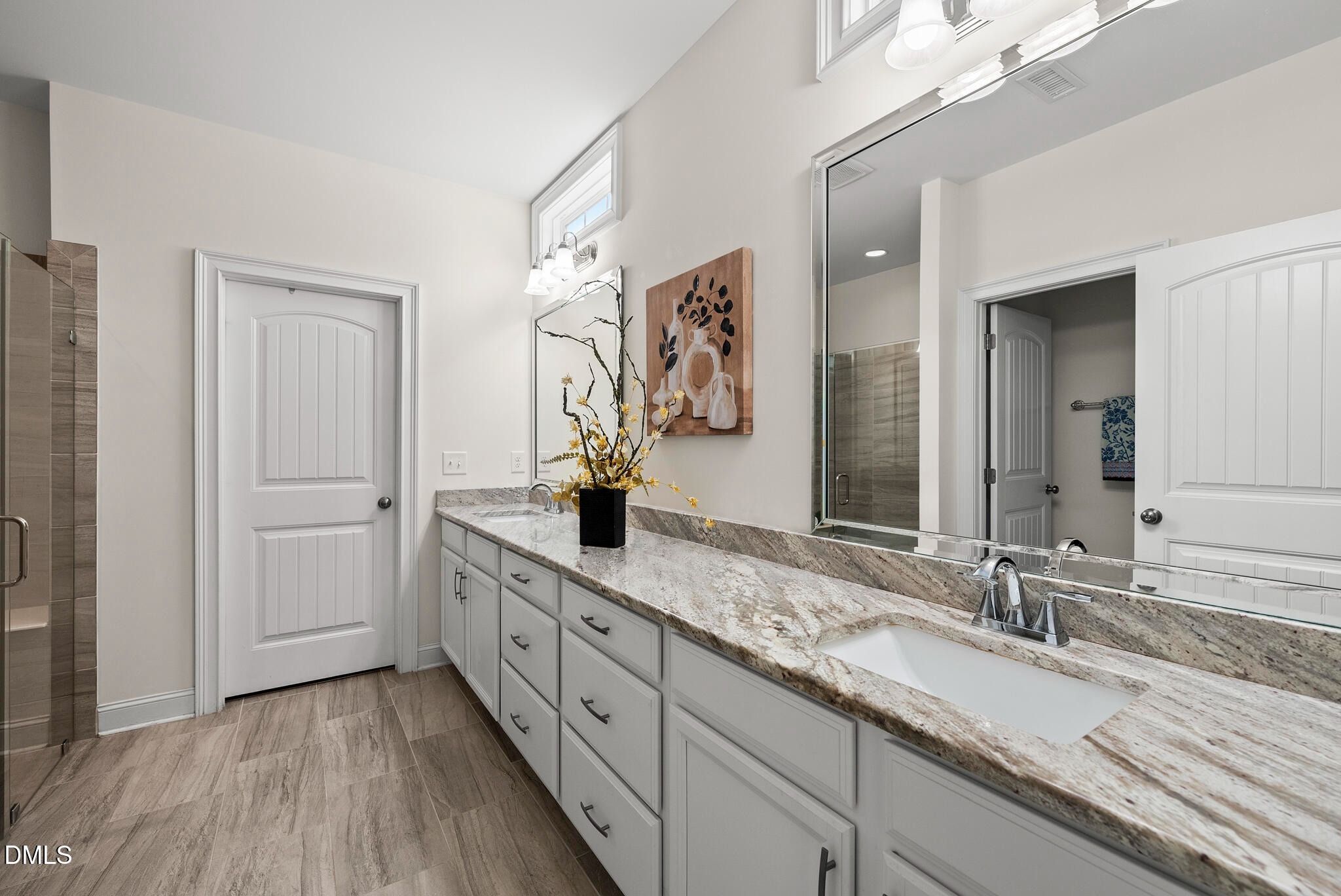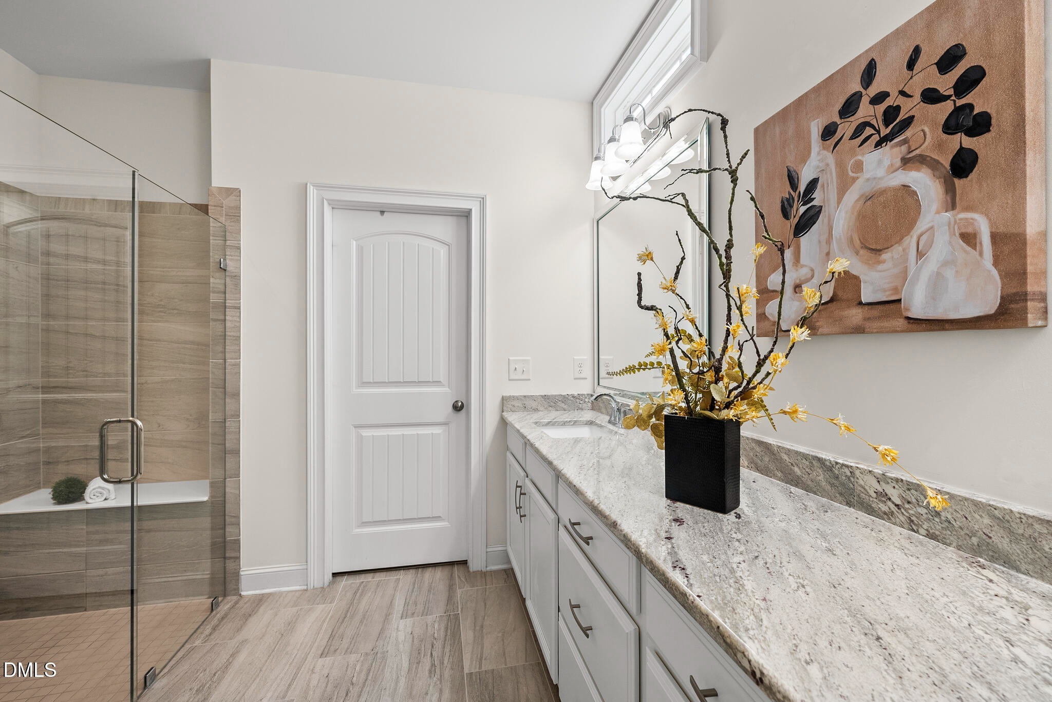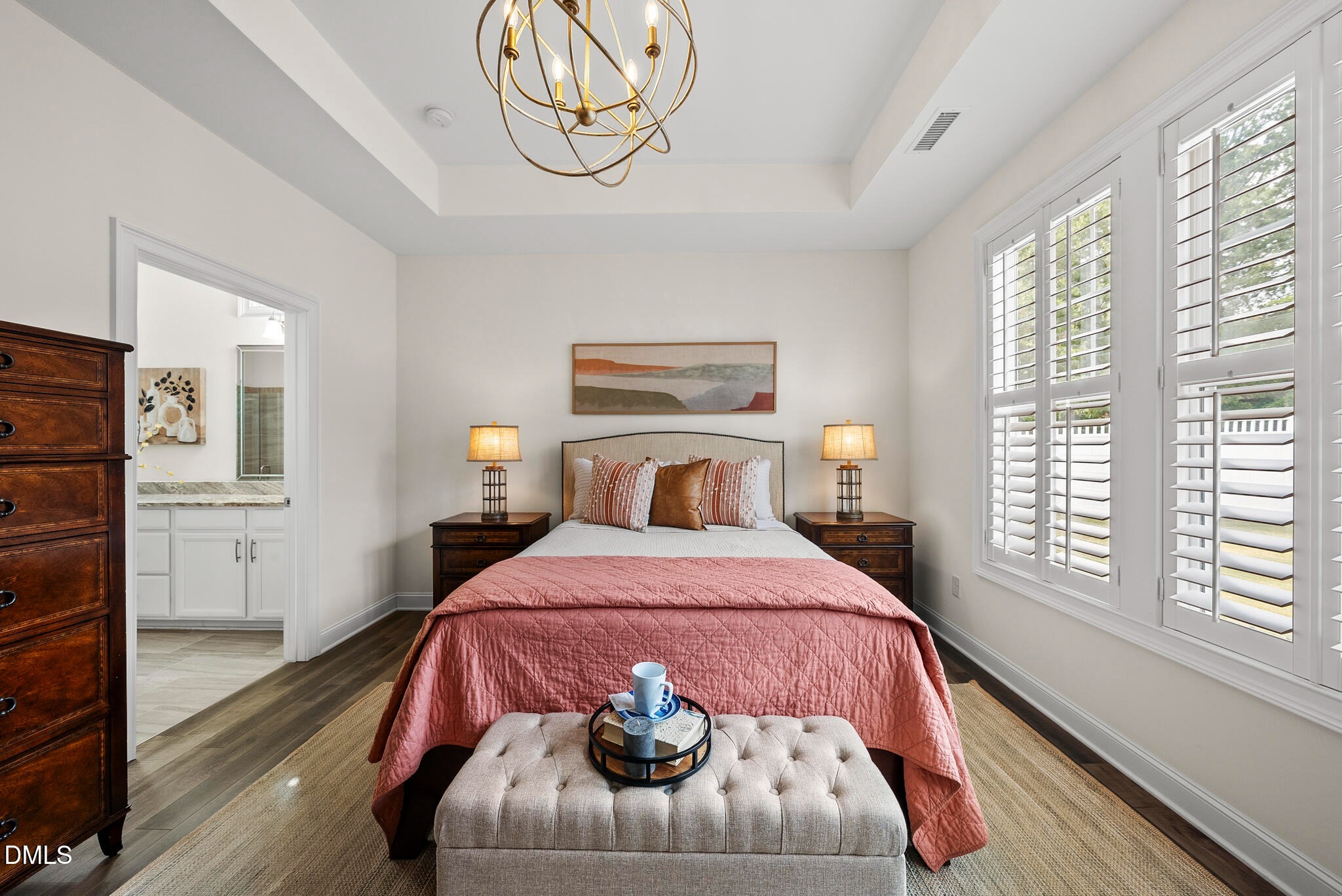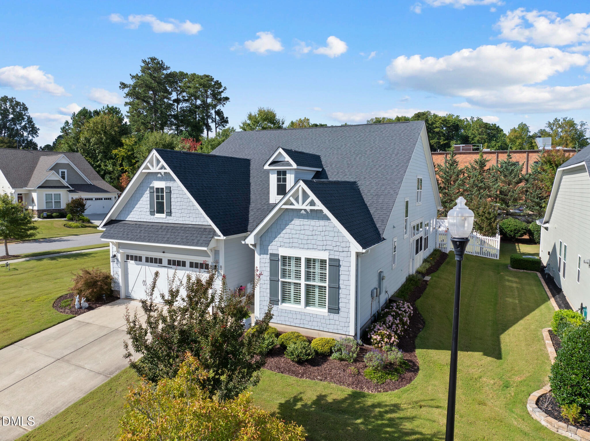 Welcome to this beautifully updated home in the desirable Traditions community of Wake Forest. Inside, an open and airy floor plan connects the family and dining rooms to the gourmet kitchen, where a large center island, granite countertops, stainless steel appliances, and custom cabinets with slide-out shelving create the perfect gathering space. A light-filled sunroom extends the living area and opens to the private backyard for year-round enjoyment. The spacious primary suite offers a relaxing retreat with tray ceilings, hardwood floors, and a spa-like bath featuring dual vanities, a walk-in closet, and a tiled aging-in-place shower. A first-floor guest bedroom with an adjacent full bath provides convenience and flexibility, while the upstairs loft and two additional bedrooms share a full bath. Outdoor living is equally impressive with a private patio, custom landscaping, retractable awning, 6-foot vinyl fence, and an in-ground sprinkler system. Paired with resort-style community amenities and a sought-after Wake Forest location, this home blends style, comfort, and everyday convenience.